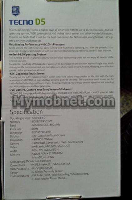 Design: The design of Tecno D5 is superb. It is now conclusive that Tecno mobile, like many Android devices will now always be buttonless so Tecno D5 is no less. The 4 inched screen device is of light weight, slim with rounded corners that will readily slide into your pocket. So Mymobnet! Thinks the design of Tecno D5 is great.